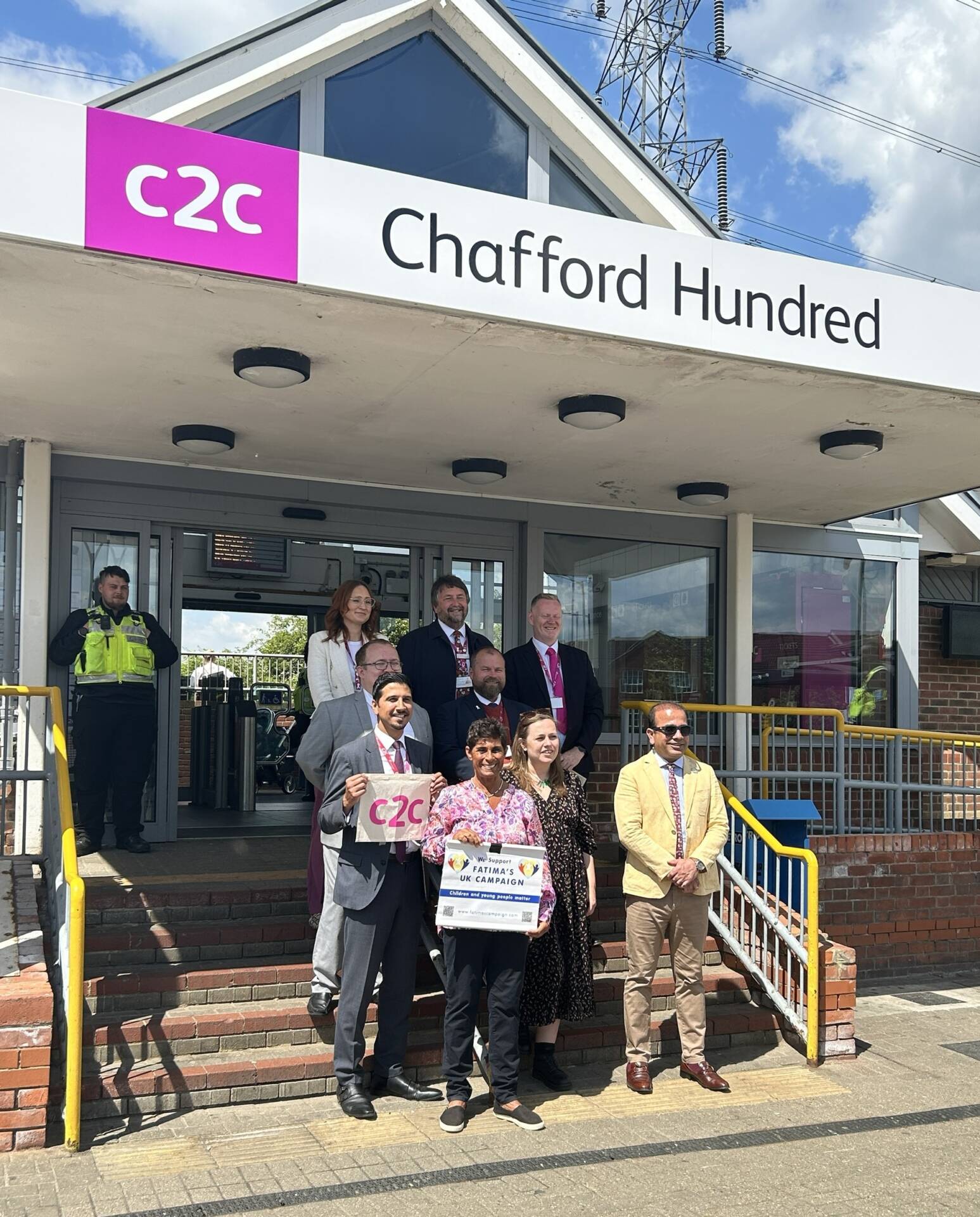 Image 2  c2c team with Fatima Whitbread MBE and community partners outside Chafford Hundred station. Front row l-r Fatima Whitbread MBE and Councillor Qaisar Abbas, second row l-r   Abu Siddeeq, c2c’s Interim Director for HR and Communications and Jen Craft MP for Thurrock, third row l-r  Councillor Aaron Green and Iain Palmer c2c’s Head of Security and Revenue Protection, back row l-r Alice Shimali, c2c’s Head of Communications, Stuart Brown c2c’s Safety, Sustainability & Compliance Director and Joe Hendry, c2c’s Head of Stations.